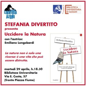 - Martedì 29 aprile, ore 18 – Presentazione del libro: “Uccidere la natura. Come l’umanità distrugge e salva l’ambiente” di Stefania Divertito. Introduce e dialoga con l’autrice Emiliano Longobardi.