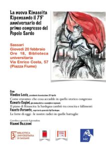 - Giovedì 20 febbraio, are 18.00, si terrà l’appuntamento La nuova rinascita – Ripensando il 75° anniversario del congresso del popolo sardo. Interverranno 𝐕𝐢𝐧𝐝𝐢𝐜𝐞 𝐋𝐞𝐜𝐢𝐬, 𝐑𝐞𝐧𝐚𝐭𝐨 𝐂𝐮𝐠𝐢𝐧𝐢 𝐞 𝐅𝐚𝐮𝐬𝐭𝐨 𝐃𝐮𝐫𝐚𝐧𝐭𝐞. L’evento è organizzato con l’associazione 25 aprile e la CGIL Sardegna.