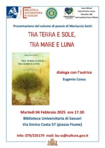 - Martedì 4 febbraio, ore 17:30, presenteremo, in collaborazione con il Club Inner Wheel di Porto Torres, il libro di 𝐌𝐚𝐫𝐢𝐮𝐜𝐜𝐢𝐚 𝐒𝐞𝐜𝐡𝐢 “Tra terra e sole, tra mare e luna”. Dialogherà con l’autrice 𝐄𝐮𝐠𝐞𝐧𝐢𝐨 𝐂𝐨𝐬𝐬𝐮.