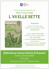 Presentazione del libro “LVII – Elle Sette” di Maria Teresa Tedde. Introduce il nostro direttore Giovanni Fiori. Dialoga con l’autrice, Antonello Colledanchise, psicoterapeuta. Interventi musicali del duo Antonello Colledanchise-Susanna Carboni